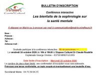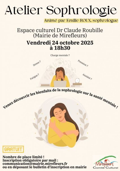 Le Comité Culturel de Mirefleurs vous propose un atelier sophrologie composé d'une conférence interactive et d'exercices de sophrologie autour du thème : les bienfaits de la sophrologie sur la santé mentale.