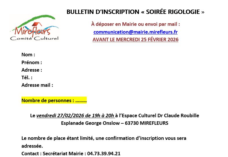 Inscription obligatoire par mail à communication@mairie.mirefleurs.fr