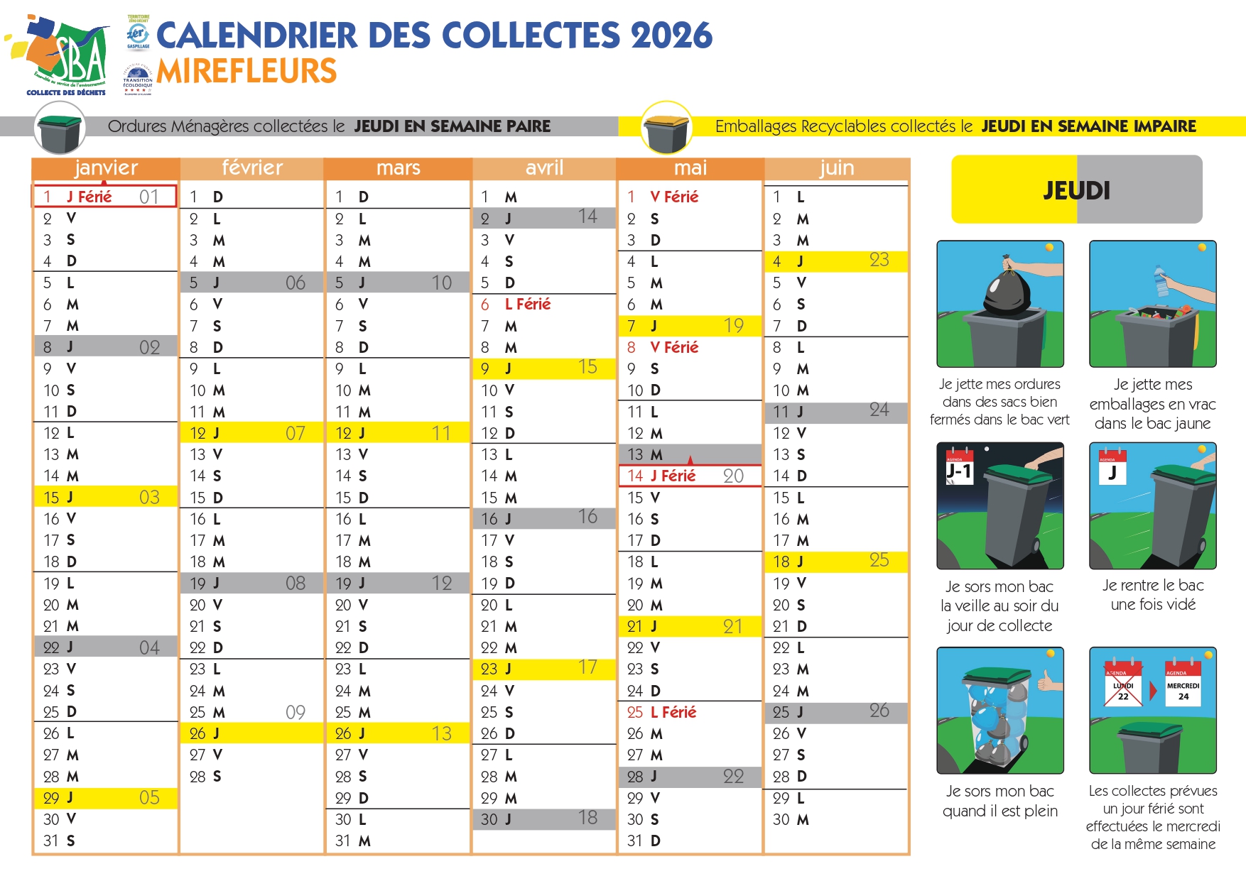 Il est disponible sur le site internet du SBA : https://www.sba63.fr/sites/default/files/Mirefleurs_1.pdf et vous pouvez également passer en mairie pour obtenir un exemplaire du calendrier de collectes imprimé.